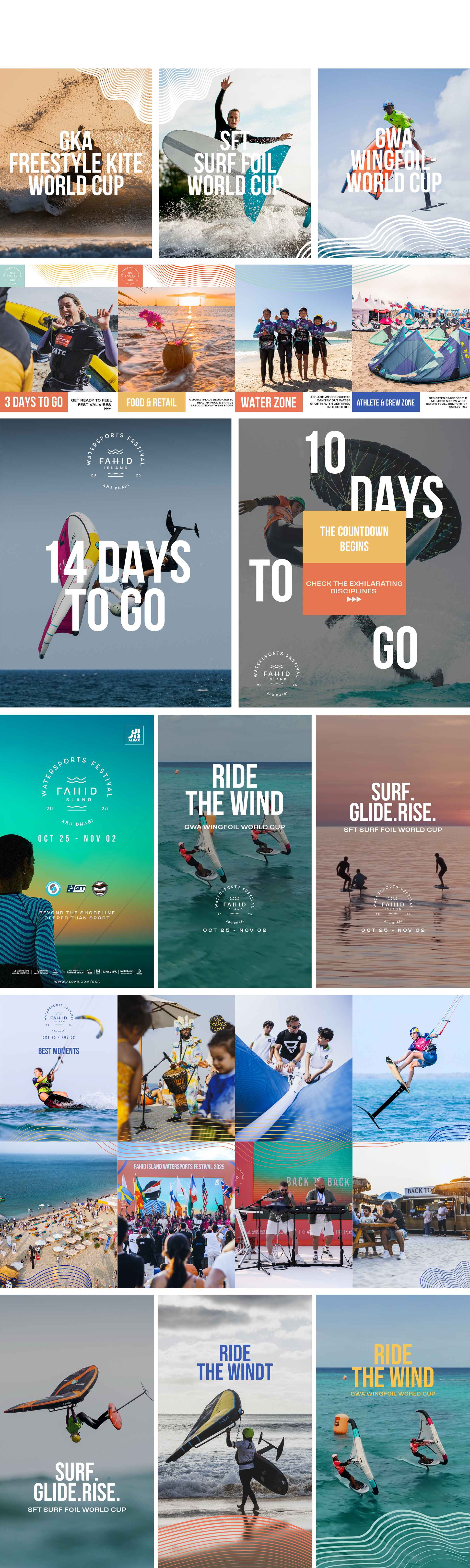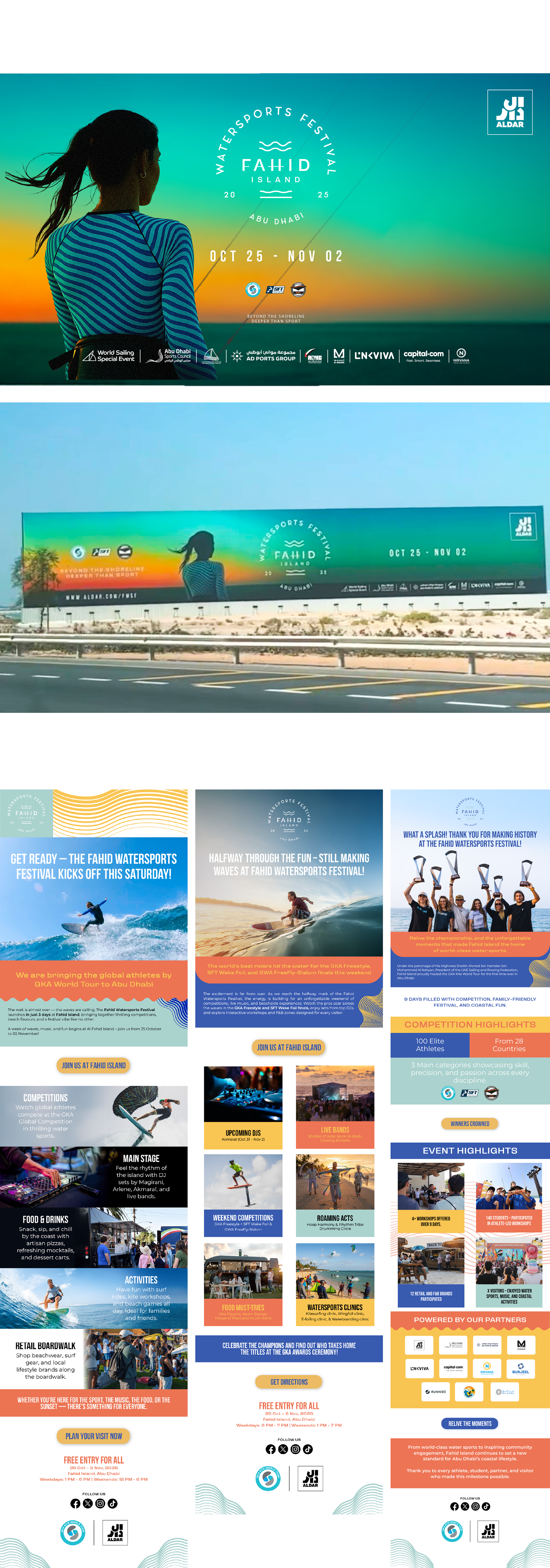 Fahid Water Sports Festival is a premier international event hosting global competitions like the GKA Kite World Tour and the GWA Wingfoil World Cup. The designs capture the high-intensity energy of these elite watersports, utilizing the event’s brand elements to reflect a dynamic, coastal-sport aesthetic across 11km of Abu Dhabi’s shoreline.